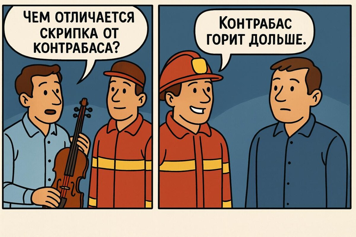 *** Во время пожара сторонние наблюдатели могут насладиться тремя приятными зрелищами одновременно: как горит огонь, как течёт вода, как работают другие люди. *** Музыкант спрашивает у пожарного: – Чем отличается скрипка от контрабаса? – Контрабас горит дольше. *** Пожарные обычно не торопятся тушить возгорание в банках. Говорят, что финансовые учреждения гасятся кредитами. *** Гадалка нагадала мальчику блестящее будущее: носить красивую форму и быстро подниматься по карьерной лестнице. Предсказание сбылось: он стал пожарным. *** Молодой пожарный хвастается друзьям: – Работа – сказка: ночью спим, днём в шашки играем, потом три выходных! – А если пожар? – Если пожар – хоть увольняйся! *** – Кто главный враг пожарного? – Муха! Спать мешает! *** Пожар на заводе свечей пожарные тушили в очень уютной, тёплой и романтической обстановке. *** – Алло, пожарные? – Да. – Тут врач с полицейским дерутся! Не знаю, куда ещё позвонить... *** Пожарный рассказывает товарищам: – Мой сын настолько гордитс