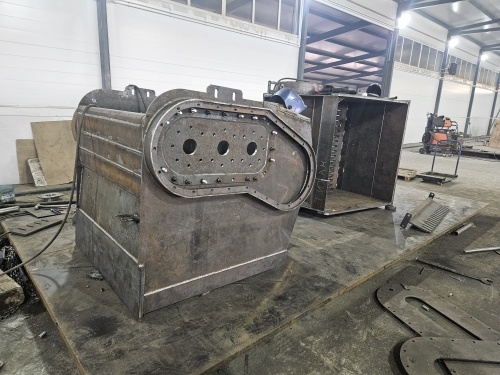 На ЗАВОДЕ КОВШЕЙ в Санкт-Петербурге налажено производство валковых дробильных ковшей «ЧебуРАША» с приводом рабочих элементов, содержащим зубчатые передачи. В наших сменных устройствах есть герметичные картеры и предусмотрена жидкостная смазка. Трансмиссионное масло заливают через специальное отверстие, выполненное в верхней части картера (у ковша «ЧебуРАША» два картера); ещё одно отверстие предназначено для контроля уровня масла. Таким способом смазываются подшипниковые опоры вращающихся валов с «лепестками» и зубчатые передачи. С целью повышения ремонтопригодности навесного оборудования каждый рабочий узел может быть демонтирован и установлен по отдельности. Для этого стаканы с подшипниками каждого вала с «лепестками» закреплены на стенках корпуса ковша с помощью болтовых соединений. В зависимости от модификации «ЧебуРАША» крутящий момент на каждом валу с «лепестками» может составлять 2400, 4800, 7200 или 9600 Н/м. В конструкции привода навесного оборудования предусмотрена возмож