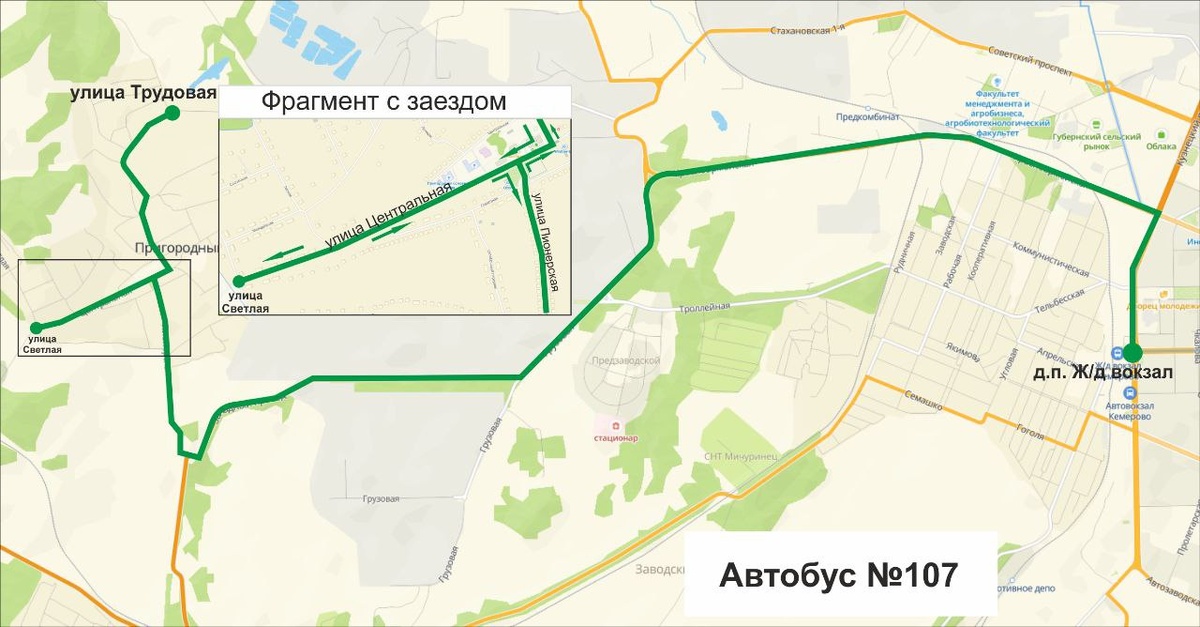 С 25 октября изменится путь следования межмуниципального маршрута №107 «д.п. Железнодорожный вокзал – ул. Трудовая», который курсирует до поселка Пригородного Автобус будет делать заезд до остановки «ул. Светлая» при движении в направлении города. Путь следования маршрута № 107: в прямом направлении: д.п. Железнодорожный вокзал, просп. Кузнецкий, ул. Красноармейская, ул. Грузовая, ул. Западный проезд, ул. Пионерская, ул. Центральная, ул. Угловая, ул. Садовая, ост. «ул. Трудовая»; обратно: ост. «ул. Трудовая», ул. Садовая, ул. Угловая, ул. Центральная, остановка «ул. Светлая», ул. Центральная, ул. Пионерская, ул. Западный проезд, ул. Грузовая, ул. Красноармейская, просп. Кузнецкий, д.п. Железнодорожный вокзал. Время отправления: - от д.п. Железнодорожный вокзал - в 6-28*, 7-30, 8-39, 10-31, 11-40, 12-49, 13-58, 15-15, 16-27, 17-40, 19-32, 20-44, 21-48, 22-47. (*рейс от остановочного пункта «КОАО Азот»); - от конечной ост. «ул. Трудовая» - в 6-00, 6-50, 8-02, 9-11, 11-05, 12-12, 13