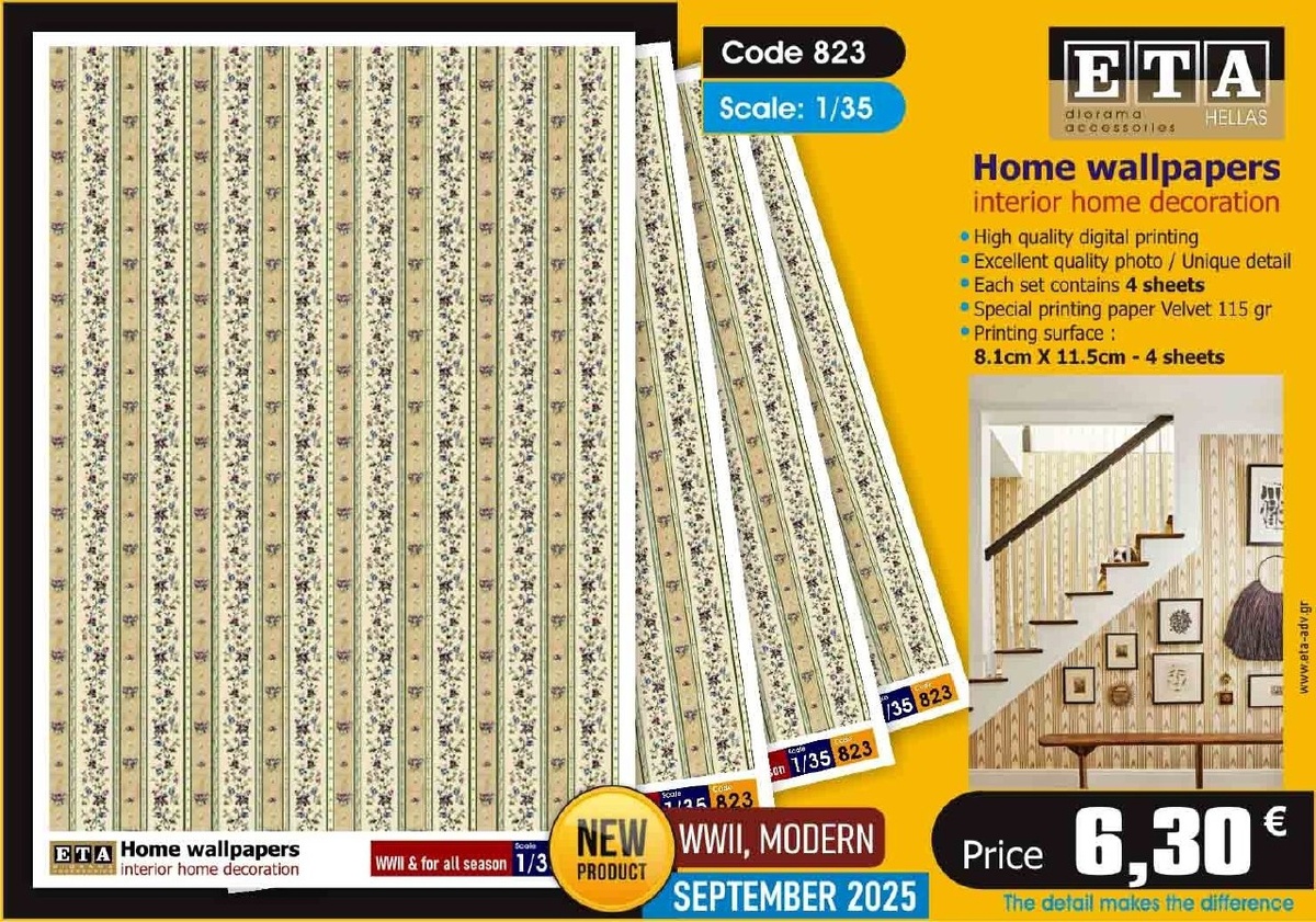 ETA Diorama из Греции выпустила бумажные обои для диорам и виньеток в масштабе 1/35: 823 - Home Wallpapers - 4 листа 824 - Wooden Floor - 3 листа 825 - Old Wooden Floor - 4 листа 826 - Old Wooden Wall - 3 листа 827 - Old Wooden Wall - 4 листа 828 - Old Wooden Floor - 3 листа