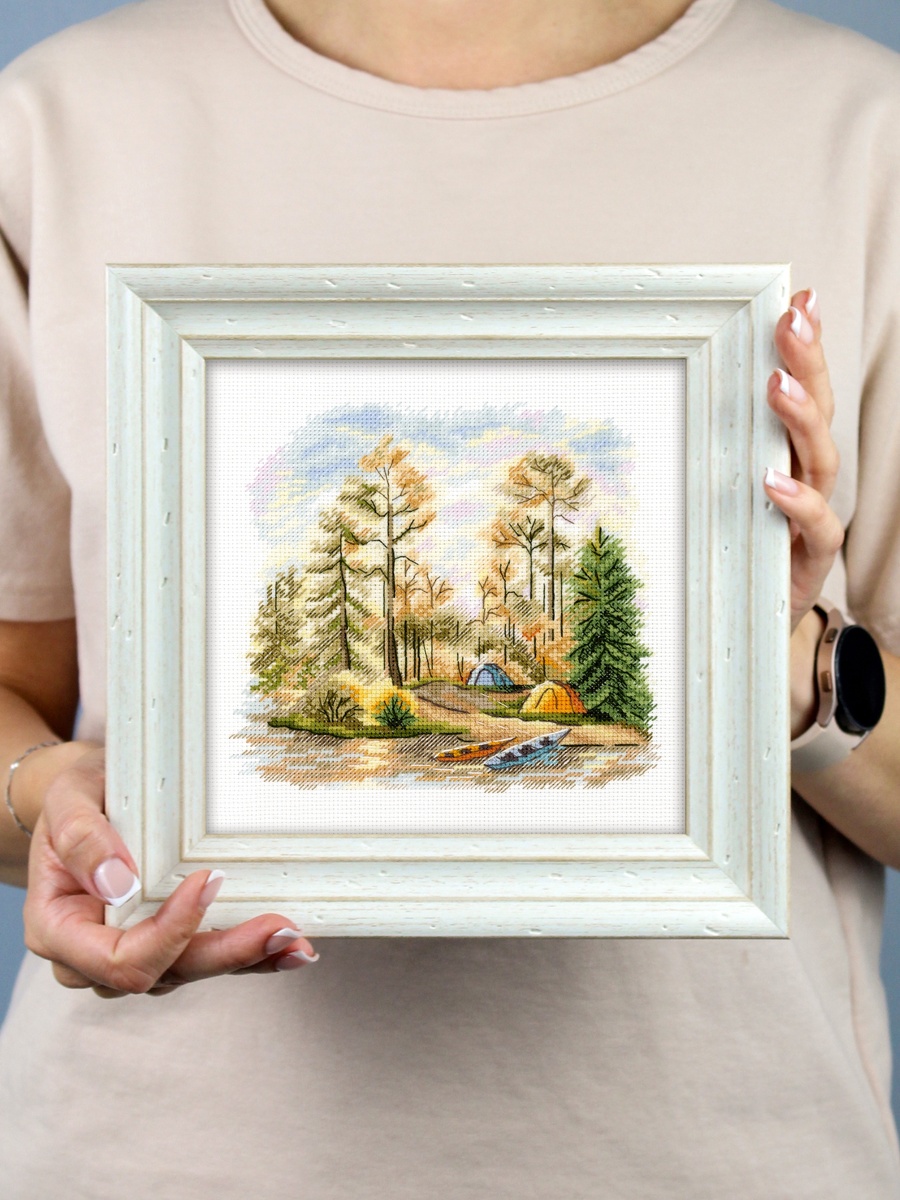 Всем большой вышивальный привет! МП Студия выпускает много разных красивых сюжетов, но вот я, например, скупала у нее, в основном наборы на пластиковой канве. А в последнее время стала обращать внимание на то, что и на Аиде у них есть интересные разработки. Например, в этом году я вышивала набор с маками, очень симпатично получилось, хоть и маленького размера пейзаж. С тех пор на пейзажи МП Студии посматриваю и кое-что даже покупаю. К ноябрю вышла парочка новинок, которые тоже понравились. Не знаю, буду ли покупать или нет, но смотрятся неплохо. Набор арт. №НВ-954 «В сосновом лесу». Состав набора: белая хлопчатобумажная канва 16 каунта, нитки мулине Гамма 26 цветов, разобранные на органайзере, игла, бумажная цвето-символьная и электронная схема, вышивальная линейка, нитковдеватель, руководство по вышиванию. Размер готовой работы: 15*16 см. Красиво. Но я бы убрала палатки - нисколько не турист и мне их среди леса видеть не хочется. Диссонанс возникает. Тихий-мирный лес и туристы, котор