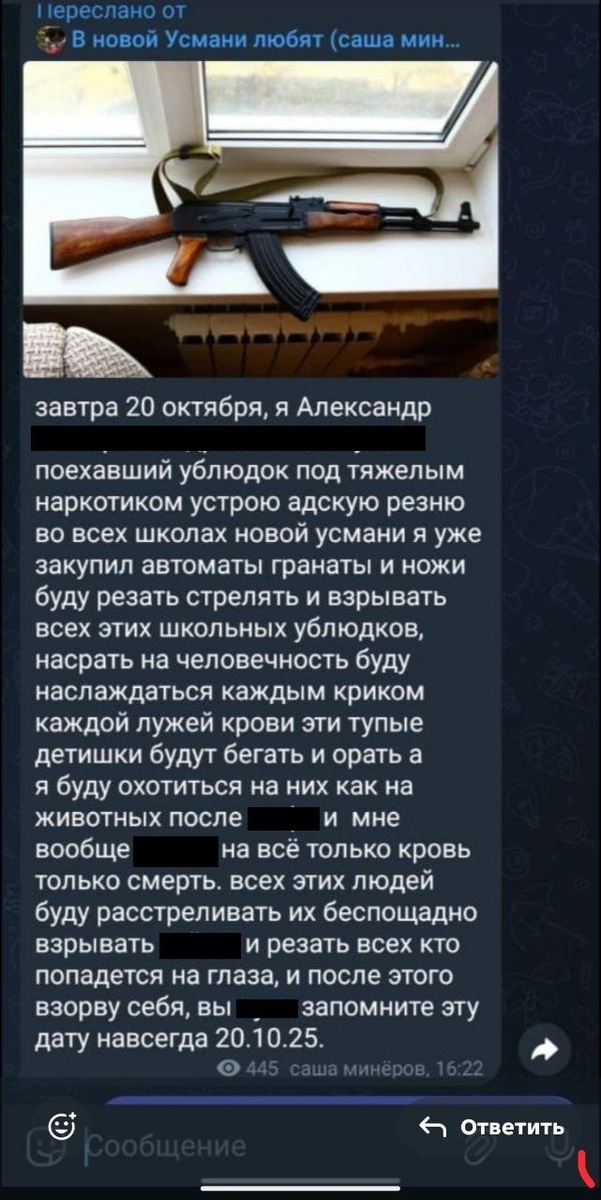 Недавно в мессенджерах стали распространяться публикации из телеграм-канала «В Новой Усмани любят», где от имени некого Александра Минерова опубликовали угрозу устроить террористический акт в одной из школ Новой Усмани. Как позже сообщили в канале «Война с фейками. Воронежская область», реальной угрозы теракта в учебных заведениях нет. Все сообщения – фейк украинских ЦИПсО, направленный на запугивание учеников и их родителей: «Аккаунт админа телеграм-канала «В Новой Усмани любят» зарегистрирован на украинский номер. Александр Минеров, от чьего имени распространялись угрозы, не проживает в Воронежской области. Мы имеем дело с телеграм-каналом, созданным украинскими ЦИПсО для дестабилизации ситуации в нашей стране». Канал был создан весной прошлого года. Когда в нем удалось собрать школьную аудиторию, его стали использовать для провокаций. В закрытом канале уже выложили видео, на котором «готовящийся теракт» назвали пранком. Голосом Минерова, который и признается в провокации, вещает ней