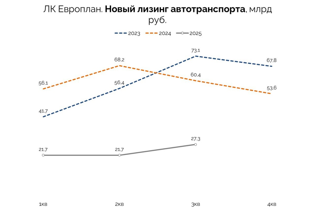 Из отчета за 9 мес. 2025 г. видим, что сначала года Европлан закупил и передал в лизинг 21 тыс. единиц транспорта и техники на 70,7 млрд руб. (-52% и -62% г/г соответственно).