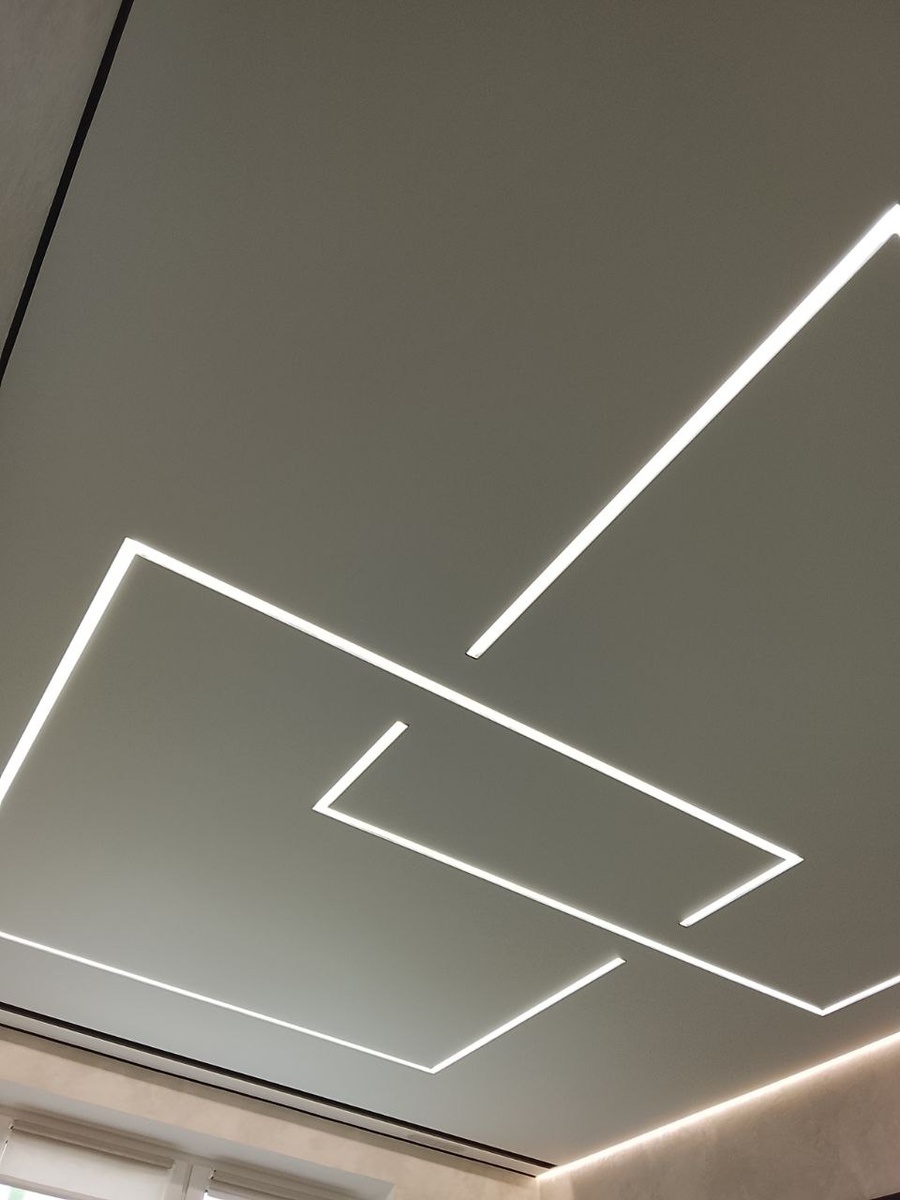 Раньше натяжной потолок воспринимали как способ быстро выровнять поверхность и спрятать провода. Сегодня всё иначе. Потолок — это основа атмосферы. И главный инструмент в создании этой атмосферы — не цвет и не фактура, а правильно встроенная подсветка. В одном из наших проектов в Гомеле мы сделали ставку на лаконичность и точный свет. Вместо точечных светильников использовали световую линию шириной 35 мм с чёрным поликарбонатным плафоном. Это не просто освещение — это графический элемент, который подчёркивает форму помещения. Его геометрическая чёткость добавляет интерьеру характер, а мощность 24 Вт на погонный метр обеспечивает яркое, но комфортное освещение — без резких теней и усталости для глаз. Вся система управляется с пульта. Это не «для эффекта» — это реальное удобство. Нужен яркий свет утром? Приглушённый — вечером? Меняется за секунды. Без выключателей, без вставания с дивана. Ключевая часть конструкции — металлический карниз со скрытой нишей в тон потолку: глубокий чёрный.