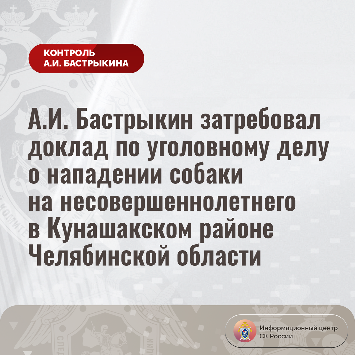 А.И. Бастрыкин затребовал доклад по уголовному делу о нападении собаки на несовершеннолетнего в Кунашакском районе Челябинской области В Информационный центр СК России поступило обращение по вопросу несогласия с ходом установления обстоятельств нападения собаки на четырехлетнего ребенка в Челябинской области. В августе текущего года агрессивное животное, находившееся на выгуле на берегу озера Куяш в Кунашакском районе Челябинской области без поводка и намордника, набросилось на малолетнего, откусив часть уха. Пострадавший госпитализирован. Обращения граждан в различные инстанции результатов не принесли. До настоящего времени виновный к ответственности не привлечен. В СУ СК России по Челябинской области возбуждено уголовное дело. Председатель Следственного комитета Российской Федерации Александр Иванович Бастрыкин затребовал у и.о. руководителя СУ СК России по Челябинской области Константина Владимировича Правосудова доклад об установленных в ходе проведенных следственных действий обсто