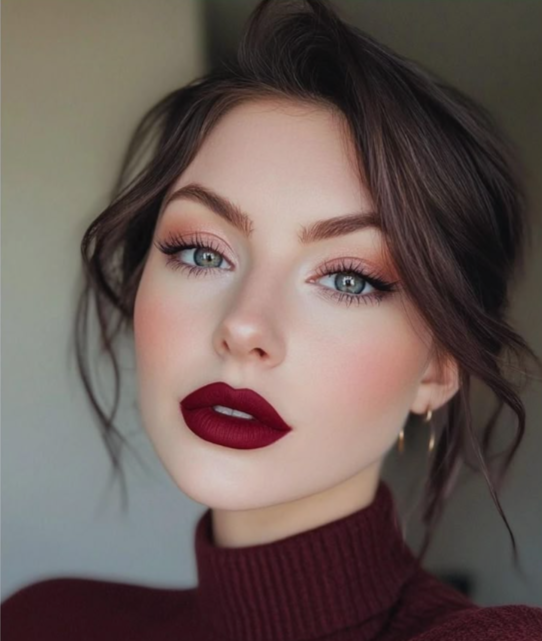 Я всегда тяготела к ярким глазам и нюдовым губам, но попробовала этот вариант и влюбилась в свое отражение. С высокой прической - то, что доктор прописал! При этом бордовая помада, в отличие от красной, безопаснее. Но контур губ надо рисовать аккуратнее.