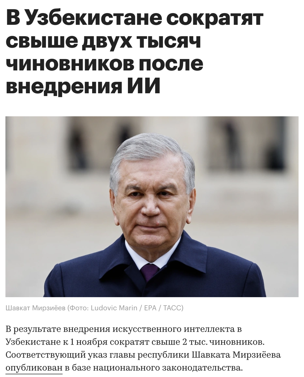 На днях в новостях появилось заявление президента Узбекистана Шавката Мирзиеева — страна планирует сократить более 2000 чиновников уже к 1 ноября, а их работу частично поручить искусственному интеллекту. Звучит амбициозно, но насколько это реально? Разберёмся без эмоций и хайпа.