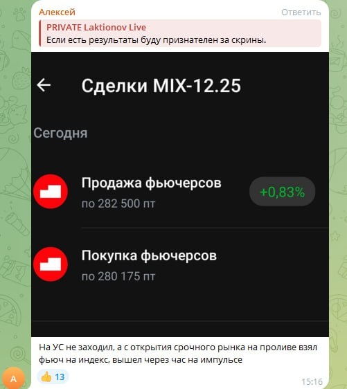 🆘Немного результатов из закрытого ТГ канала по сегодняшней сессии ❗️День на 100% по плану. ЛОНГ обоснован на 100%, даже с учетом форс мажора. 🆘 Присоединяйся!!! ТГ канал @LaktionovPrivat_bot - Подписка отбивается за одну сделку!