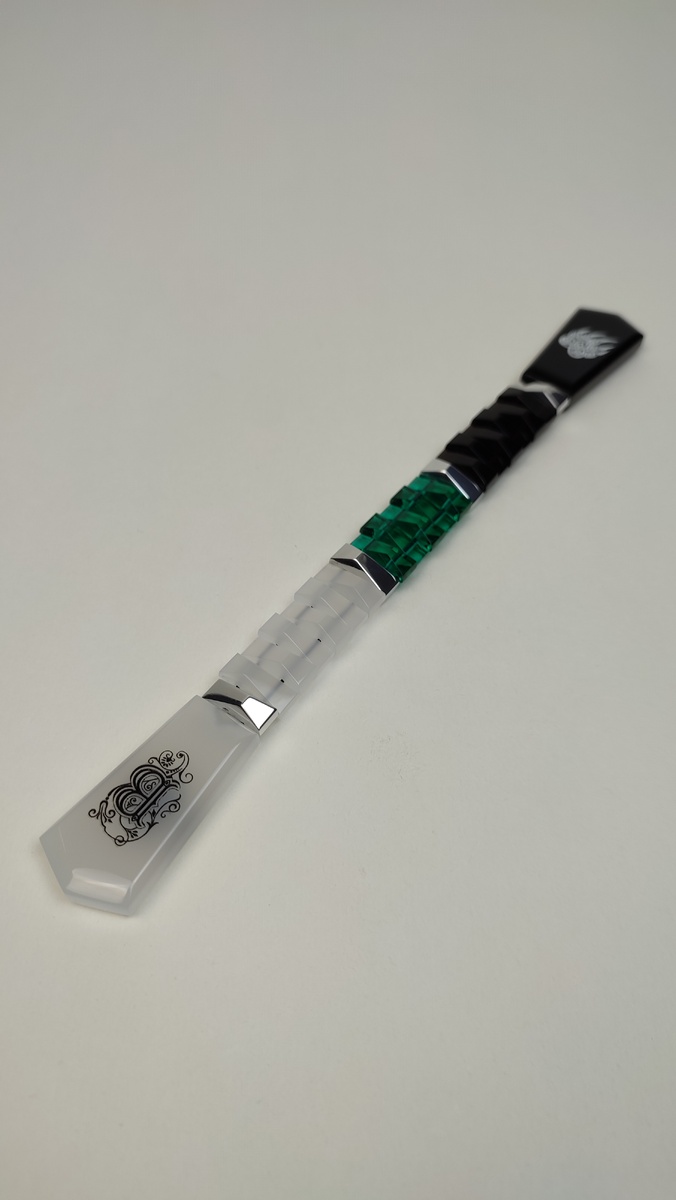 толщина ~ 8−8,5 мм. Добавлены 4 алюминиевые вставки Гравировка нанесена на четыре поверхности из четырёх, содержит в себе два эскиза. Молочная и чёрная стороны — будто два полюса: свет и тень, день и ночь Между ними изумрудный центр, словно мост, соединяющий противоположности Секции разделены алюминиевыми звеньями — акцент, который подчёркивает переход и придаёт эффектности всей композиции. На конечниках гравировки в зеркальном контрасте: чёрная на молочном и молочная на чёрном.