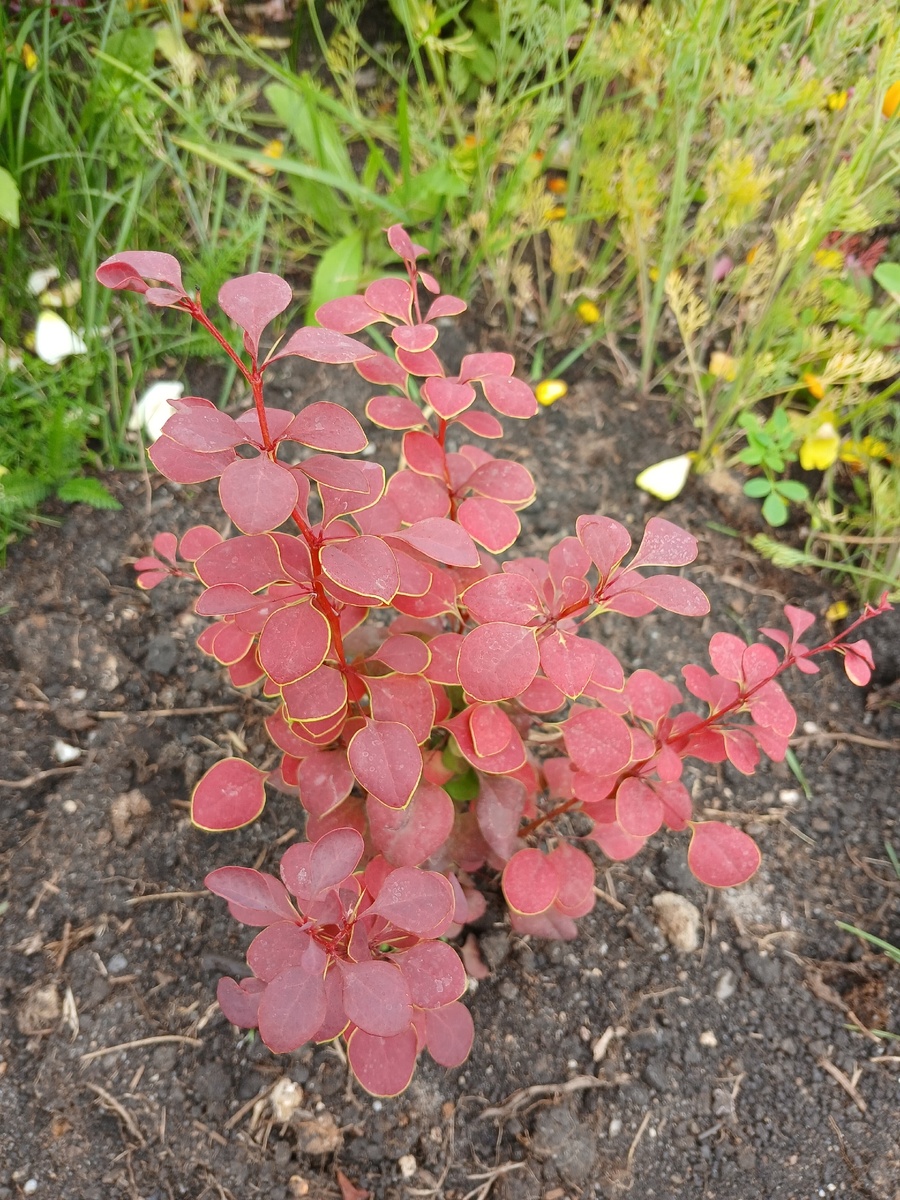Ещё маленький, и жёлтая кайма видна не на всех листьях, но всё равно хорошенький. Высажен на полном солнце, поэтому листья в течение сезона останутся яркими красно-оранжевыми (сейчас, кстати, когда солнца меньше, он начал заметно темнеть). В соседях никого большого и жадного нет, поэтому конкурировать за питание ни с кем не должен. У меня нет особой любви к растениям с тёмной красно-бордово-фиолетовой листвой, но такой яркий малыш с каймой, надеюсь, неплохо впишется в будущий миксбордер.