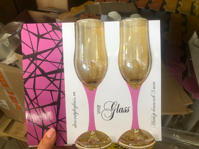 Сначала мое внимание привлекли наборы бокалов для шампанского. Очень изящные, на высокой ножке, смотрятся дорого и стильно. В продаже есть два варианта: прозрачные и с эффектом «хамелеон» — переливаются в зависимости от освещения, будто легким золотистым блеском. В каждом наборе три бокала объёмом 240 мл. Производитель — г. Гусь-Хрустальный, а цена радует: всего 299 рублей за комплект.