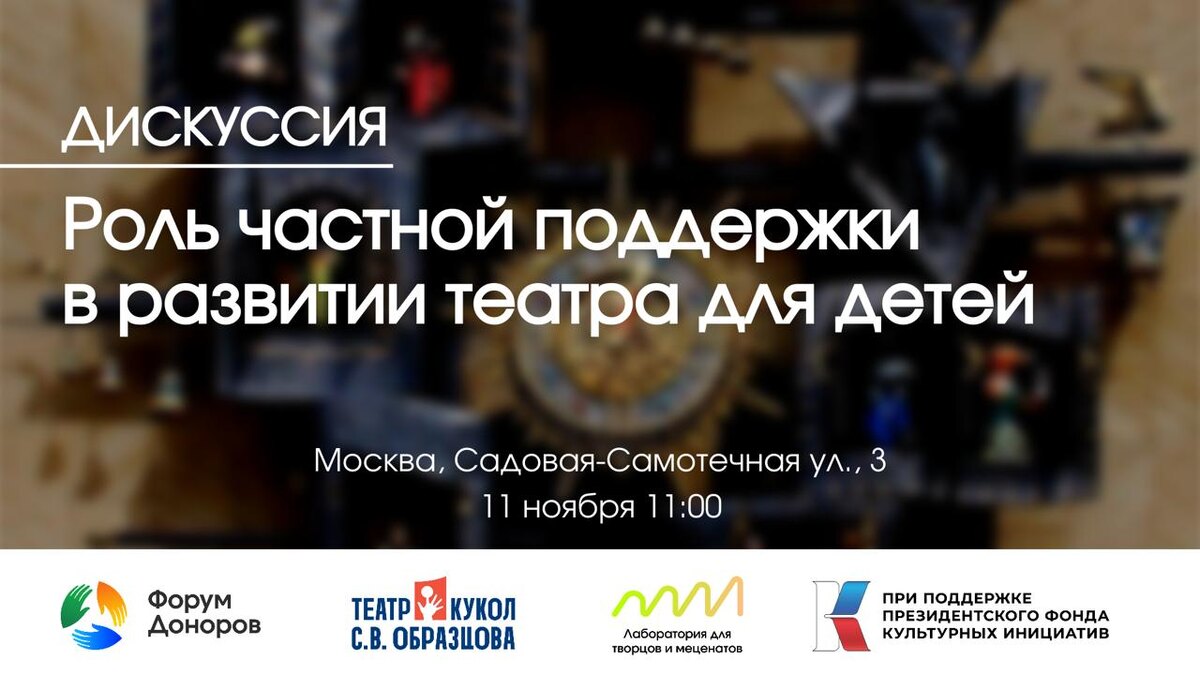 Форум Доноров организует экспертную дискуссию о частной поддержке театрального искусства для детей и юношества в партнерстве с Государственным академическим центральным театром кукол имени С.В. Образцова. В программу входит экскурсия и посещение музея театра.