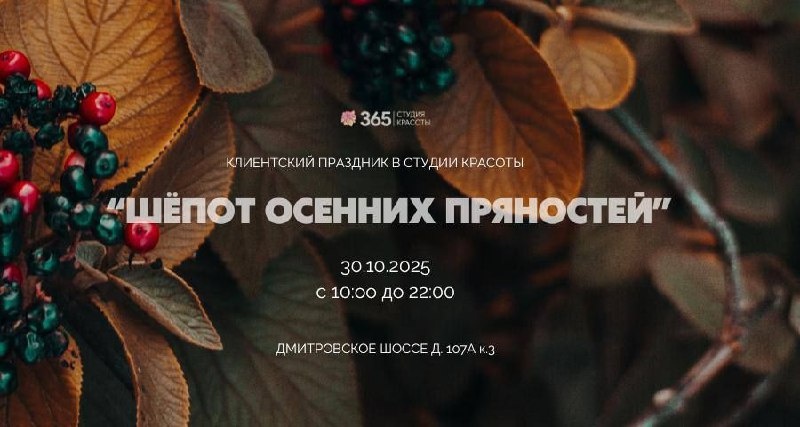 Дорогие гости, через десять дней мы ждем вас на нашем клиентский празднике – «Шёпот осенних пряностей»🍃 Мы подготовили для вас особые предложения: ✔ -20% на ВСЁ: от услуг студии и любимой косметики до стильных аксессуаров и бижутерии. ✔ Сертификаты с бонусом +20% к номиналу! А главное – вас ждет атмосфера уюта, заботы и настоящего домашнего тепла. Позвольте себе расслабиться, насладиться моментом и получить заряд красоты и позитива. Встретим вас с улыбкой, согревающим напитком и вкусным угощением. 🌟 Записаться на праздник осени можно любым удобным способом: 👉🏻 Сообщение в Whats'app https://wa.me/79663654477 👉🏻По телефону +79663654477 👉🏻Онлайн запись https://n286444.yclients.com/