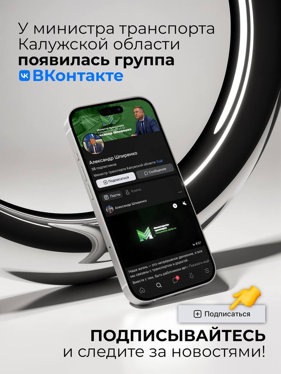 Друзья, спешим сообщить, что у министра транспорта Калужской области Александра Шпиренко появилось сообщество ВКонтакте!