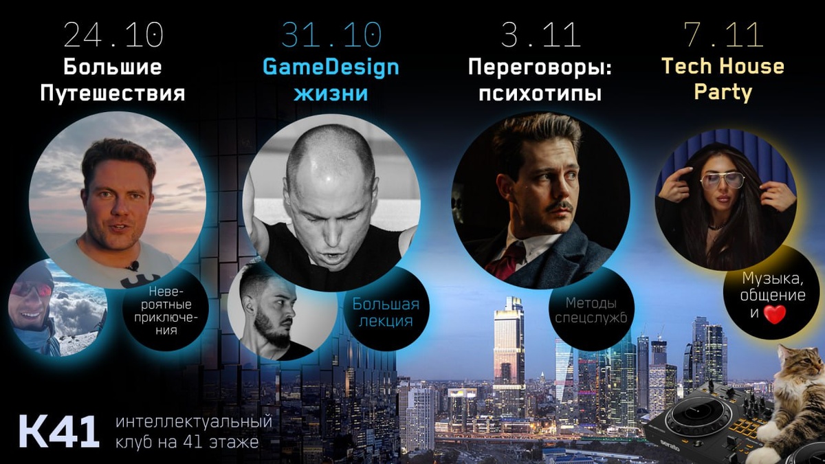 Расписание К41 сентябрь-октябрь — уже 3-й год мы встречаемся на 41 этаже в формате “Конференция + Ужин" и провели 45 конференций, где каждый гость получает идеи и контакты нового уровня