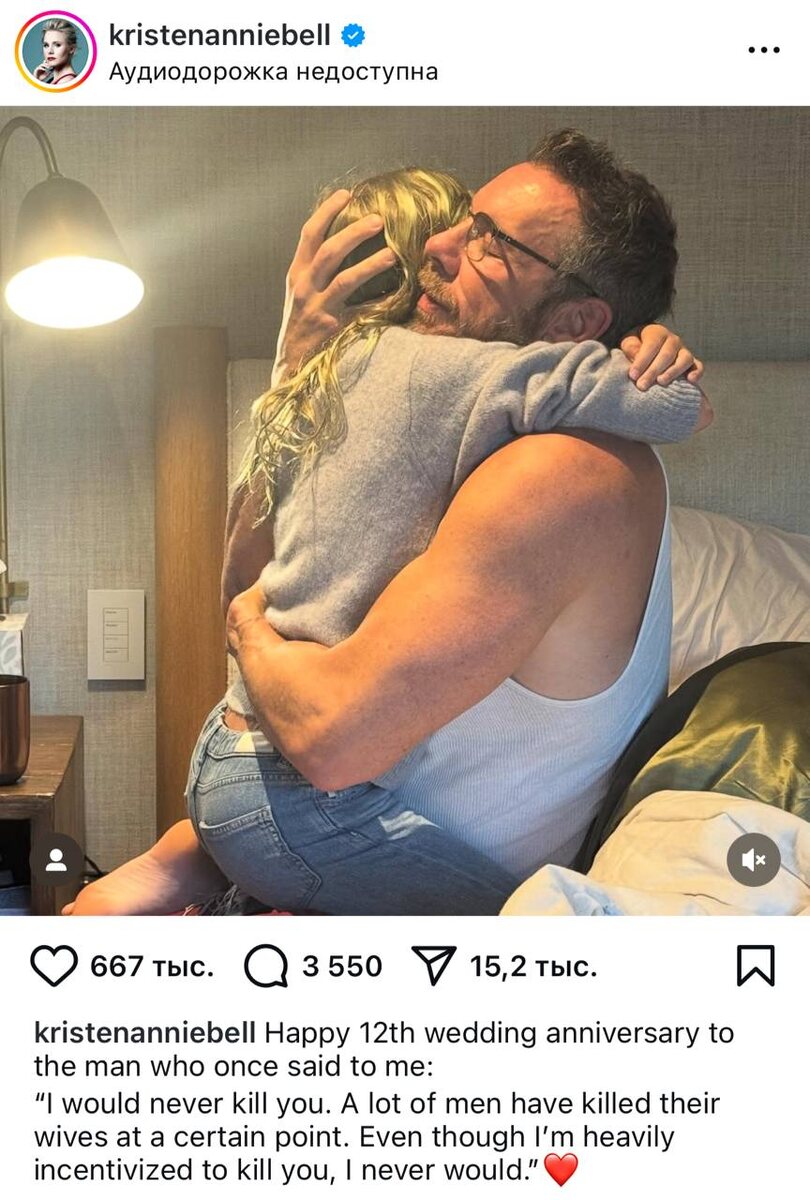 годовщиной. «Поздравляю мужчину, который однажды сказал «Я никогда тебя не убью. Многие мужчины в какой-то момент убивали своих жен. Но несмотря на то, что у меня есть все причины это сделать, я тебя все равно не убью». Комментарии под постом вскоре пришлось закрыть.
