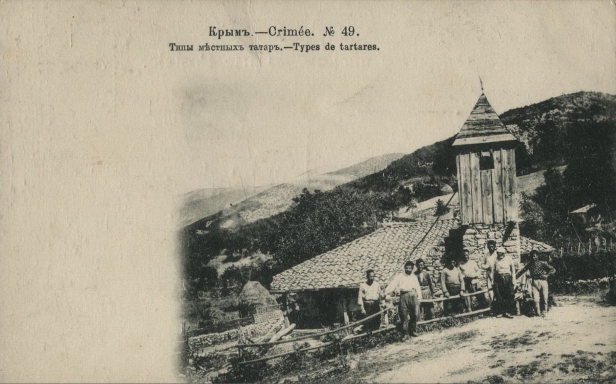 Крым. Типы местных татар. Деревня Албат (ныне - Куйбышево, Бахчисарайский р-он). На заднем плане - мечеть. Согласно: Списки населенных мест Российской империи, составленные и издаваемые Центральным статистическим комитетом Министерства внутренних дел. Таврическая губерния по сведениям 1864 года / обработан ред. М. Раевским. — 1865. В деревне Албат было 60 дворов, жителей: 180 мужчин, 140 женщин. Две мечети. Смотри, также: открытка деревня Албат #Албат #Куйбышево #архитектура #мечеть #этнография #открытки