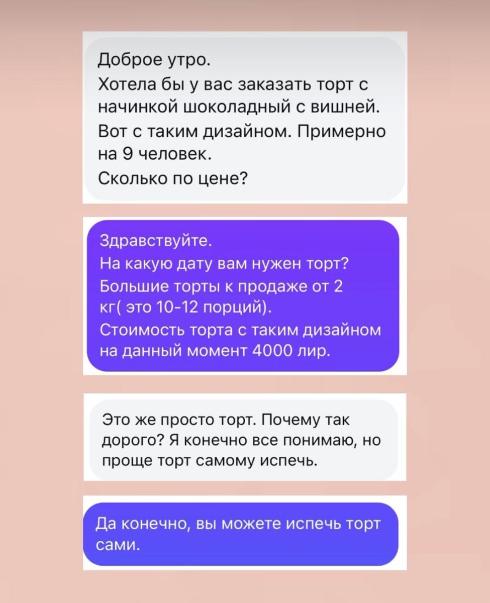 Девушка удивилась такой стоимости, посчитала, что она высокая и бросила что-то типа "Лучше самой испечь". Я предложила ей испечь самой, на этом наш диалог был завершен.