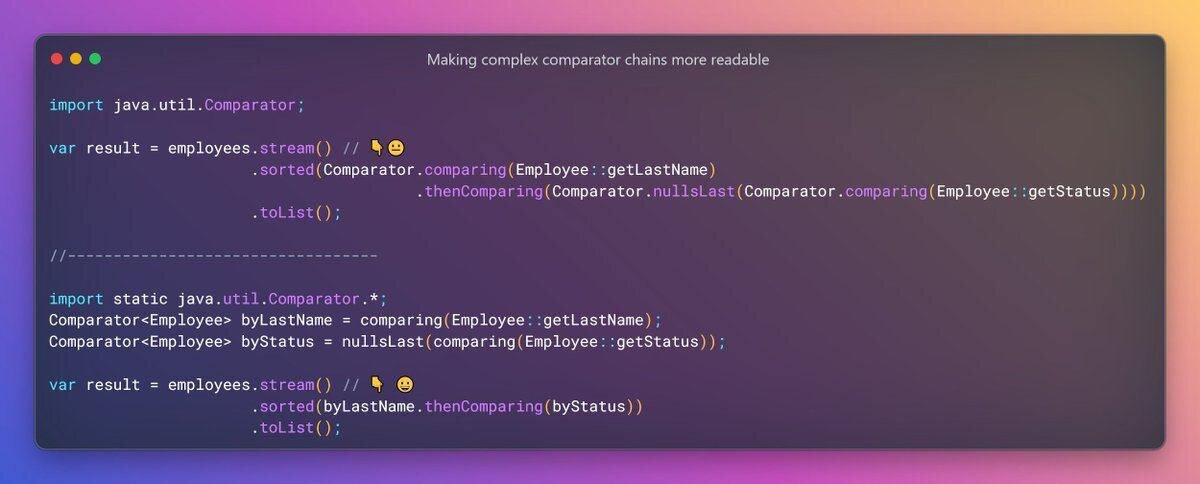 Чтобы сделать большие и сложные цепочки компараторов более читаемыми, мне нравится присваивать компараторы переменным, имена которых начинаются с "by". Таким образом, вызов sorted() становится меньше и читается почти как естественный язык. Кроме того, вы можете использовать статический импорт.