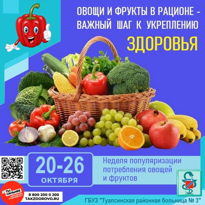 САМОЕ ВАЖНОЕ ОБ ОВОЩАХ И ФРУКТАХ Овощи и фрукты занимают важное место в рационе питания и являются ценным источников витаминов, углеводов, органических кислот и минеральных веществ. Польза плодоовощной продукции неоспорима и заключается в обеспечении нормального функционирования организма. Согласно последним рекомендациям ВОЗ, необходимо потреблять не менее 400 гр. овощей и фруктов в день. Оптимальное количество зависит от целого ряда факторов, включая возраст, пол и уровень физической активности человека. Потребление овощей и фруктов в достаточном (и даже выше рекомендуемого) количестве приносит многоплановую пользу: - способствует росту и развитию детей; - увеличивает продолжительность жизни; - способствует сохранению психического здоровья; - обеспечивает здоровье сердца; - снижает риск онкологических заболеваний; - снижает риск ожирения; - снижает риск развития диабета; - улучшает состояние кишечника; - улучшает иммунитет. #укреплениеобщественногоздоровья
