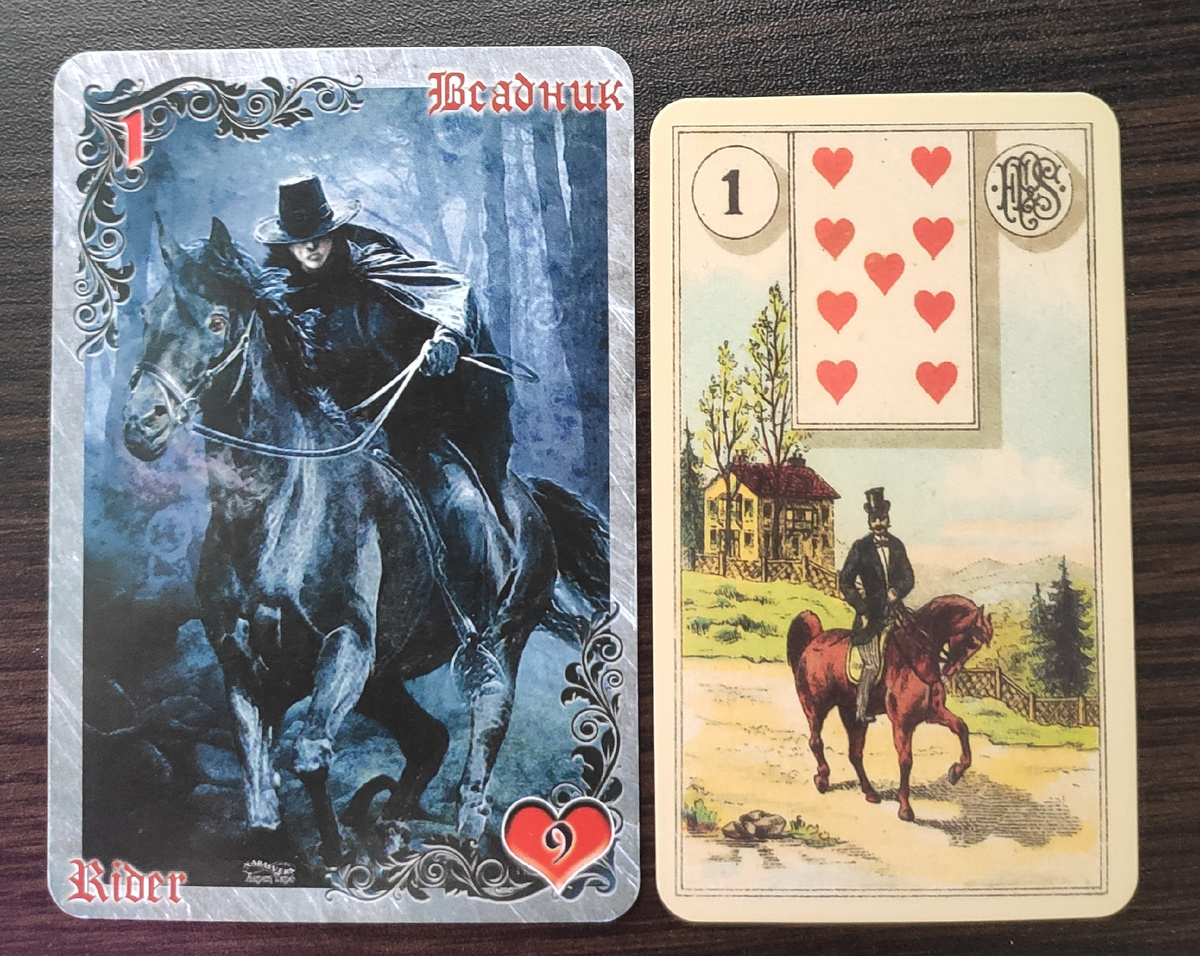 🧿карта ВСАДНИК 👁️ ТАЙНА СТАРОГО ЗАМКА колода Ленорман 📌Я буду рассматривать карту и описывать её через собственное восприятие ✍️По желанию присоединяйтесь к описанию карты. 📝Возможно Вы увидите🔎что-то другое... ______________ Карта ВСАДНИК Эта карта самая динамичная на мой взгляд. Главный герой в ней Всадник, но Всадник без седла...он не Всадник. Поэтому Всадник и лошадь - это одно целое, их сердца бьются в один такт. Всадник занимает центральное место на карте, а это значит нет ничего важнее, чем он. Всадник облачён в чёрное одеяние, что делает его невидимым для многих - плащ невидимка, а шляпа скрывает личность. Лошадь как ночь чёрная, что делает её также незаметной среди деревьев. Потому как выглядит лошадь, она скорее первоклассный скакун. Его мускулистое тело говорит само за себя - он способен даже обогнать собственную тень, что может не каждая лошадь. Тело Всадника наклонено вперёд, это положение позволяет удержаться в седле, потому как скорость запредельная. Скакун на