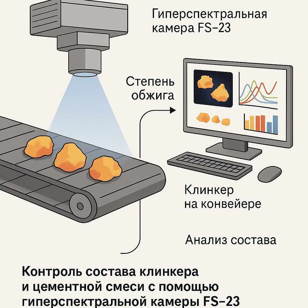 Современное производство цемента требует непрерывного контроля состава клинкера и стабильности параметров обжига. Традиционные лабораторные методы, основанные на отборе проб и последующем рентгенофлуоресцентном (XRF) анализе, обеспечивают высокую точность, но не позволяют реагировать на отклонения в режиме реального времени. Использование гиперспектральной камеры FS-23 позволяет перейти к непрерывному спектральному контролю и автоматизированному управлению качеством продукции непосредственно на конвейере. Гиперспектральная камера FS-23 регистрирует отражённое излучение от поверхности материала в диапазоне 900–1700 нм, формируя трёхмерный массив данных («спектральный куб»). Каждый пиксель изображения содержит индивидуальный спектр отражения, по которому можно судить о химико-минералогическом составе материала. Для клинкера это позволяет количественно оценивать содержание фаз C₃S, C₂S, C₃A, C₄AF, а также степень обжига и остаточную влажность. Камера FS-23 устанавливается над транспорт