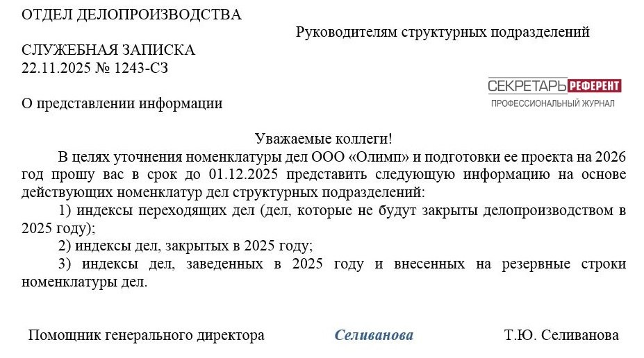 Служебная записка Уточнение номенклатуры дел связано не только с обновлением состава дел, но и с редакцией заголовков, сверкой сроков хранения, приведением в порядок примечаний к делам. Без участия коллег секретарь не сможет уточнить разделы номенклатуры дел. Поэтому он запрашивает информацию у работников, ответственных за делопроизводство в структурных подразделениях. Для этого составляется служебная записка (Пример).