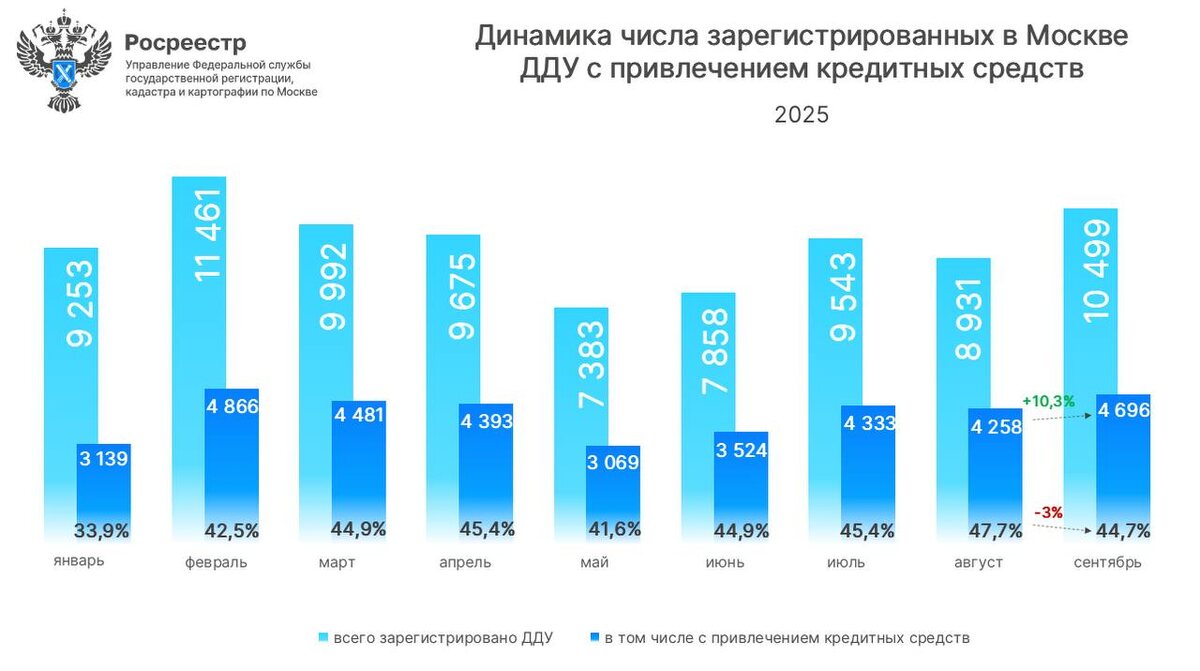 ΠΡΠ΅Π³ΠΎ Π·Π° ΡΠ½Π²Π°ΡΡ-ΡΠ΅Π½ΡΡΠ±ΡΡ 2025 Π³ΠΎΠ΄Π° Π ΠΎΡΡΠ΅Π΅ΡΡΡΠΎΠΌ ΠΏΠΎ ΠΠΎΡΠΊΠ²Π΅ Π·Π°ΡΠ΅Π³ΠΈΡΡΡΠΈΡΠΎΠ²Π°Π½ΠΎ 36 759 ΠΠΠ£ Ρ ΠΏΡΠΈΠ²Π»Π΅ΡΠ΅Π½ΠΈΠ΅ΠΌ ΠΊΡΠ΅Π΄ΠΈΡΠ½ΡΡ ΡΡΠ΅Π΄ΡΡΠ². Π Π°Π½Π°Π»ΠΎΠ³ΠΈΡΠ½ΠΎΠΌΡ ΠΏΠ΅ΡΠΈΠΎΠ΄Ρ 2024 Π³ΠΎΠ΄Π° (57 267 ΠΠΠ£) ΠΏΠΎΠΊΠ°Π·Π°ΡΠ΅Π»Ρ ΡΠ½ΠΈΠ·ΠΈΠ»ΡΡ Π½Π° 35,8%, Π° ΠΊ 9 ΠΌΠ΅ΡΡΡΠ°ΠΌ 2023 Π³ΠΎΠ΄Π° (65 599 ΠΠΠ£) ΡΠΎΠΊΡΠ°ΡΠΈΠ»ΡΡ Π½Π° 44%.