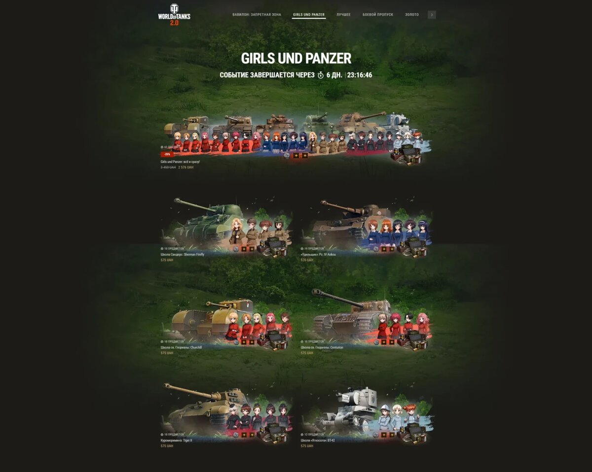 Girls und Panzer снова возвращаются в World of Tanks! На поле боя выходит дерзкая команда из школы «Сандерс». В её составе — четыре уникальных члена экипажа и американский средний танк VI уровня Sherman Firefly Saunders. Встречайте отважный экипаж и побеждайте в сражениях вместе с яркими персонажами! Даты: Наборы доступны с 20 октября, 12:00 по 27 октября, 12:00 (UTC+3). Раздел в премиум магазине: https://wargaming.net/shop/wot/gup/