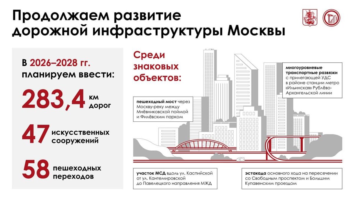 К 2026 году в столице хотят построить 283 км новых дорог, запустить 15 беспилотных трамваев и первый беспилотный поезд в метро. Откроют 13 станций: стартует Рублёво‑Архангельская линия, первый участок Бирюлёвской ветки и станция «Гольяново» на Арбатско‑Покровской.