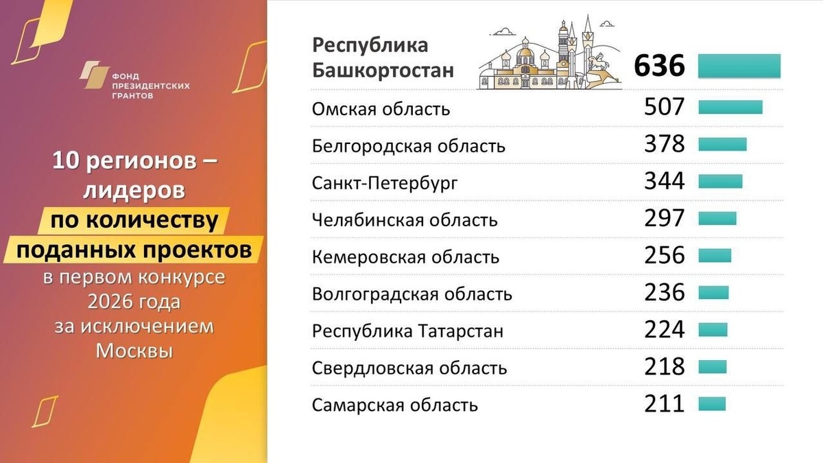 В первом конкурсе президентских грантов 2026 года некоммерческие организации Башкортостана продемонстрировали рекордную активность. Регион занял первое место в стране, подав 636 заявок на участие. На втором месте расположилась Омская область с 507 заявками, на третьем — Белгородская область с 378 проектами. Итоги конкурса будут подведены в январе 2027 года, а уже в феврале победители смогут приступить к реализации своих инициатив. Проекты башкирских НКО охватывают широкий спектр направлений — от поддержки участников СВО и помощи студентам в подготовке к экзаменам до сохранения исторической памяти о партизанах Второй мировой войны. Значительный вклад в подготовку заявок внес Ресурсный центр общественных проектов при Общественной палате Башкортостана. В течение сентября и октября эксперты проводили обучающие семинары, консультации и проектные сессии как в Уфе, так и в отдаленных районах республики. Как отметила руководитель аппарата Общественной палаты Элина Гатауллина, за каждой заявкой