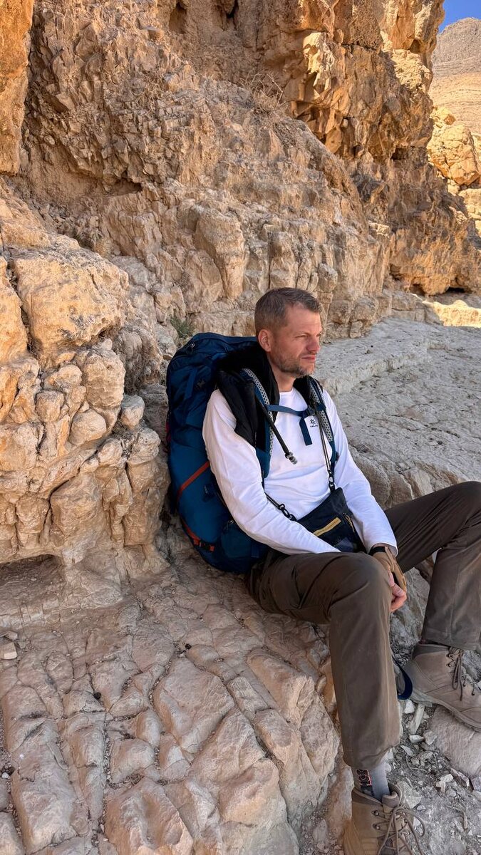 День 8. Великий спуск и окончание секции Wadi Hidan Вторая часть дня прошла на спуске, который официальный сайт пути охарактеризовал как самый опасный. Да, спускались с гидом около 2,5 часов. Да, было не просто без тренинговых палок. Да, он долгий и нудный. Но, это для меня н-о-р-м-а-л-ь-н-ы-й спуск. Просто где-то надо замедлится, где-то быть включенным в момент. Ничего сверх естественного. Как я понял инструкции на сайте пишут для совсем новичков. Но, когда я самостоятельно прошел больше 120 км в пустыне, то разве это опасный спуск? Упасть можно и на ровной дороге, подвернув ногу. Можно и в пустыне. А можно и нет. Тут зависит от твоего желания внутри🙂 В конце подошли к самому красивому месту этой секции - к реке. Я даже немного искупался и походил ногами по мокрым камням. Выдох, я прошел еще чуть чуть. У реки мы попрощались с гидом (он поднялся обратно за час и поймал машину домой), а я пошел искать кэмпинг. Но даже не предполагал чем обернуться последние пару часов до заката