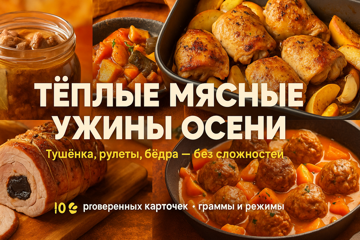 Нежнейшая домашняя тушёнка с ароматом лавра, куриный рулет с грибами и сыром, свиной рулет с черносливом, запечённые бёдра с яблоками и тмином, томлёная говядина с тыквой и «ленивые» тефтели в сливочно-томатном соусе. Всё — проверенные временем рецепты, бытовая техника, понятные граммы и режимы. Осень, накрывай на стол! 🍲🍗🍖🔥