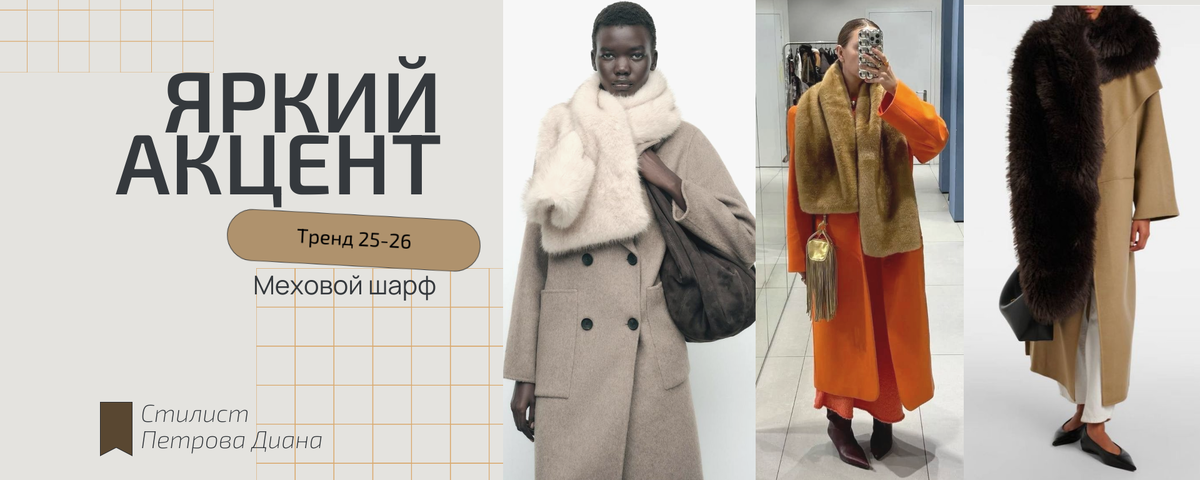 Продолжаем обсуждать тренды холодного сезона 2025-2026. Сегодня на очереди Меховой шарф. Очень практичный, на мой взгляд, аксессуар. В таком тепло, уютно, красиво. Производители предлагают варианты натуральные, приближенные к натуральным и откровенно искусственные. Какой выбрать - решать только вам. Все зависит от вашего персонального стиля, образа жизни и верхней одежды, с которой вы планируете его носить. Варианты натуральные и приближенные к натуральным добавят долю роскоши в ваш образ. Богема. Можно даже на спортивный костюм. Объем шарфа также может быть разным, от небольшого "под горло" (горжетка), до почти манто. Но не стоит относиться к нему как к предмету роскоши. Вяжем его как обычный шарф с легкой небрежностью. Некоторые производители для этого сделали прорези в самом шарфе или дополнительные планки на подкладке для крепления. Если в ваш образ вписываются яркие аксессуары, то смело берите цветной мех. Яркие краски в холодный сезон отлично разбавят образ и поднимут настроен