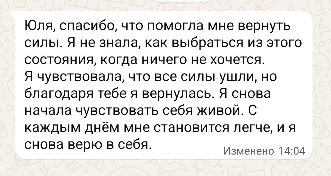Продолжение истории Натальи..👇 Когда Наталья пришла ко мне, её состояние было не просто усталостью, а настоящим эмоциональным выгоранием. 💔 Она не могла найти силы для работы, семьи или для себя. (Смотрите историю выше)👆 Что мы делали? ❤️Бесплатная консультация 🗣: Мы начали с того, что просто поговорили. Я выслушала Наталью, чтобы понять, где именно она застряла. Иногда осознание проблемы уже помогает начать процесс исцеления. ❤️Энерготерапия ✨: После консультации мы начали работать с её энергетическим состоянием. Я предложила энергетические практики, которые помогают восстановить внутреннюю силу и гармонию. Через дыхательные техники и медитации Наталья начала чувствовать, как её энергия начинает возвращаться ❤️Работа с эмоциями 💭: Мы провели работу с эмоциями, которые блокировали её энергию. Наталья осознала, что она долгое время не могла справиться с внутренними переживаниями, связанными с разводом и чувством одиночества. Это создавало у неё эмоциональную нагрузку, от котор