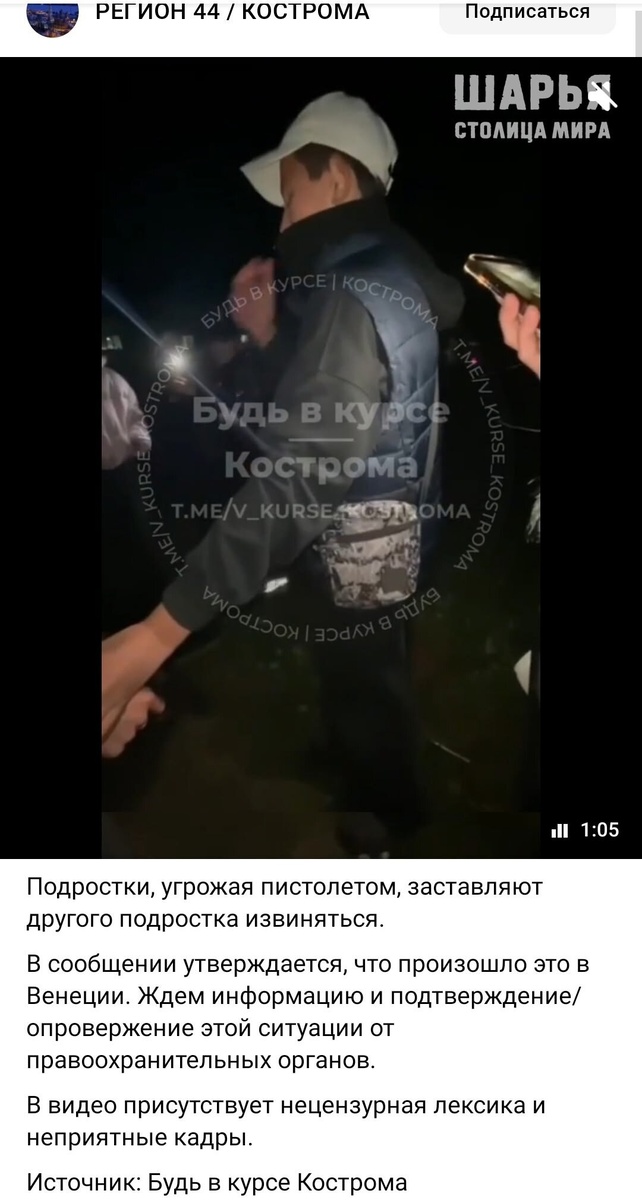 По поручению исполняющего обязанности прокурора области Николая Игнашина организована проверка по публикации видео с конфликтом между подростками в микрорайоне Венеция в Костроме. В распространенном видео запечатлены угрозы со стороны одних подростков в отношении другого за якобы нанесенное им оскорбление девушки в словесной форме. Угрозы сопровождаются нецензурной лексикой, а заставляют просить несовершеннолетнего прощения, угрожая при этом ему оружием.