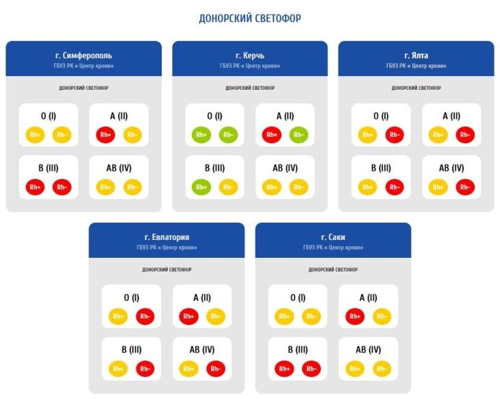 Республиканский «Центр крови» обновил данные потребности учреждения в запасах донорской крови. На этой неделе в Симферополе, Ялте, Евпатории и Саках будут рады всем желающим пополнить запасы крови и её компонентов. Ситуация с пополнением запасов крови в Керчи стабильная, здесь не хватает только доноров с положительным резус-фактором второй группы крови. «Очень ждем доноров с группой крови и резус-фактором, которые отмечены в светофоре красным и желтым! Обязательно возьмите с собой паспорт и СНИЛС. Надеемся на вашу помощь в пополнении запасов», – рассказали корреспонденту Крымского информационного агентства в «Центре крови». ЧИТАЙТЕ ТАКЖЕ: 65 крымчан провели донорскую субботу в Симферополе Напомним, что добровольно сдать кровь можно в ГБУЗ РК «Центр крови» (г. Симферополь, ул. Киевская, 37), а также в его филиалах (г. Ялта, ул. Свердлова, 14; г. Керчь, ул. Карла Маркса, 31; г. Саки, ул. Лобозова, 22; г. Евпатория, пр. Победы, 22), либо при проведении «донорских дней» выездной бригадой Ц