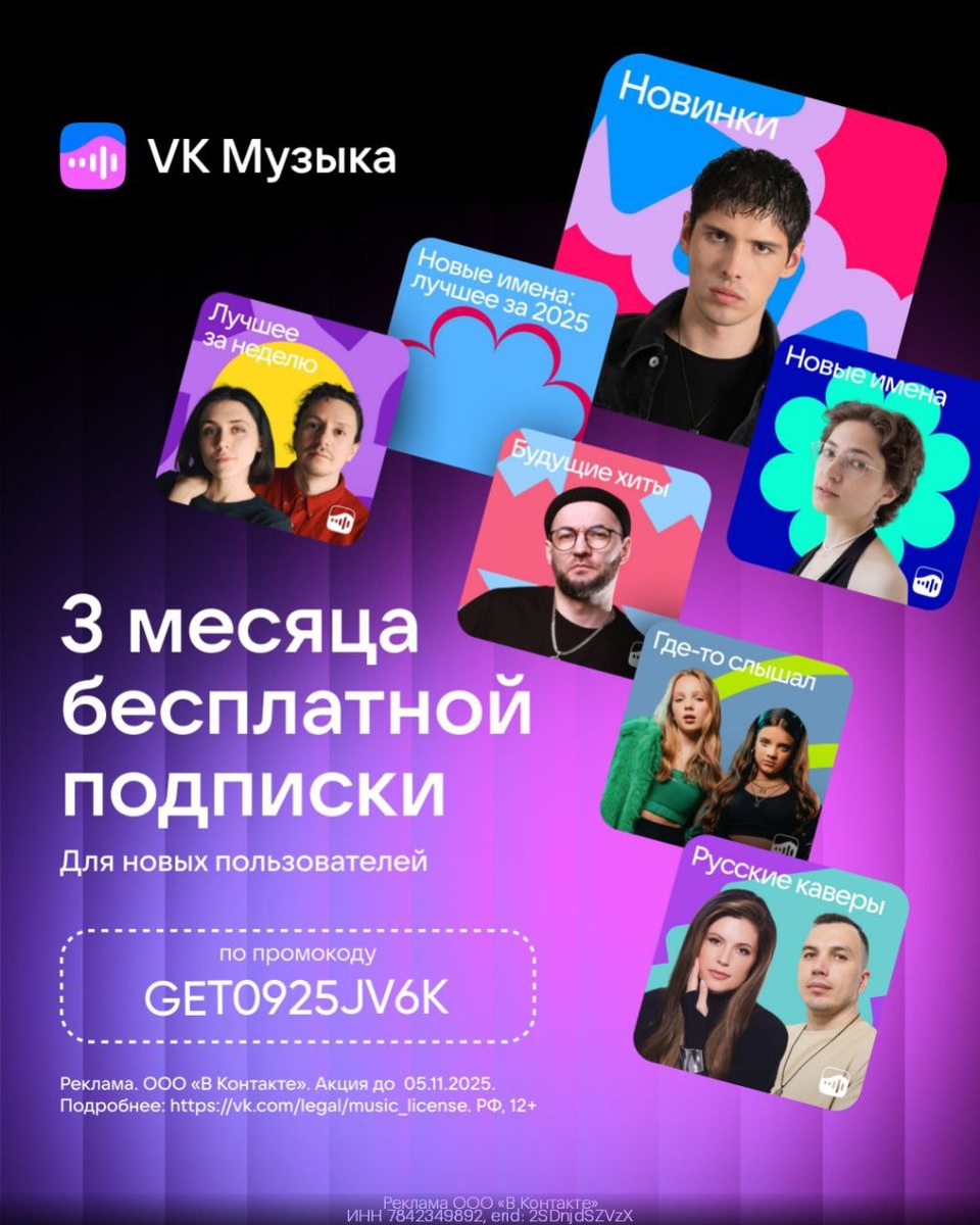 💙 VK Музыка — 3 месяца БЕСПЛАТНО! 1. Переходим по ссылке 2. Вводим промокод GET0925JV6K 👈 3. Получаем доступ к миллионам треков, тысячам подкастов и эксклюзивным альбомам артистов на целых 3 месяца бесплатно!🔥 Акция доступна по всей России для новых пользователей и тех, у кого подписка закончилась более 90 дней назад! ❗️Активация возможна только с номером телефона РФ.