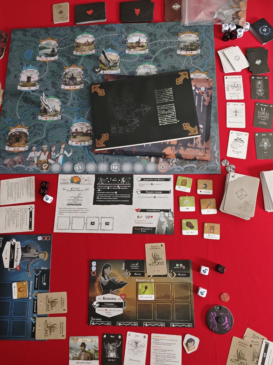 В центре стола выложена карта со множеством локаций (лично мне она сразу напомнила Древний ужас или Ужас Аркхэма 2). Каждый раунд делится на утро, полдень, вечер и ночь. В каждое время суток кроме ночи игрок может переместиться на 0-2 локации и совершить одно действие. Из действий: вы можете взаимодействовать с локацией, продвинуться по истории (если локация позволяет) или выполнить личную просьбу (если оказались в нужной локации). Как только все игроки завершили свои действия утром, переходим к полудню. И так до ночи. Ночь - это своего рода подготовка к новому дню (следующему раунду). Фаза ночи отличается от сценария к сценарию, но на планшете историй все подробно расписано по шагам.