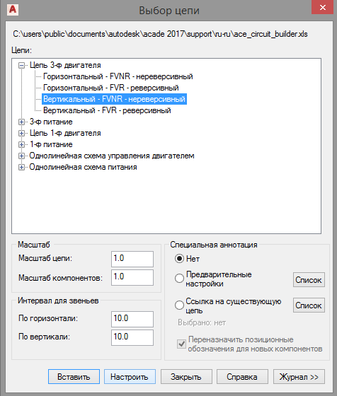 Рассмотрим методику расчета падения напряжения на примере трехфазной цепи двигателя. Запускаем Конструктор цепей, в открывшемся диалоговом окне «Выбор цепи» в разделе Цепь 3-ф двигателя выбираем Вертикальный – FVNR - нереверсивный и нажимаем кнопку Настроить. Указываем на чертеже точку вставки шаблона выбранной цепи. В открывшемся диалоговом окне «Конфигурация цепи» нажимаем кнопку Выбор диаметра проводов. В открывшемся диалоговом окне «Выбор диаметра проводов» задаем параметры нагрузки и характеристики проводов: В нижней части диалогового окна отображается таблица сечений проводов и соответствующие расчетные параметры, полученные на основе базы данных ace_electrical_standards.mdb. Провода, которые не удовлетворяют требованиям по допустимой токовой нагрузке, отображаются красным цветом. Таблица проводов содержит 3 столбца: Размер, Допустимая токовая нагрузка и %Допустимая токовая нагрузка. Если задать длину трассы проводов, то в таблицу может быть добавлена информация о падении напряже