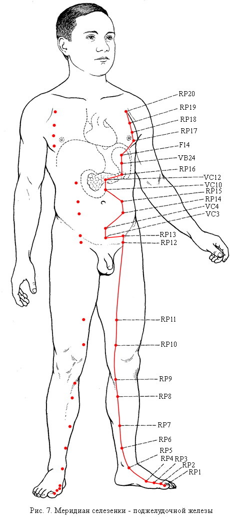Меридиан селезенки (поджелудочной железы) – парный, относится к системе инь. Движение энергии центростремительное; принимает энергию от Меридиана Желудка и передает Меридиану Сердца. Период максимальной активности меридиана с 9 до 11 часов. На Меридиане Селезенки (поджелудочной железы) 21 точка.