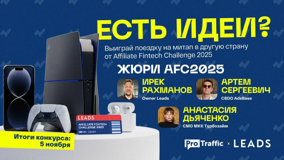 CPA-сеть Leads, которая более 15 лет успешно работает с финтех-вертикалью, совместно с медиа ProTraffic запускают Affiliate Fintech Challenge 2025 — конкурс идей и кейсов для арбитражников, байеров и команд, работающих с финансовыми офферами. Автор лучшей идеи, фичи или механики, применимой для финтех-вертикали, получит приглашение на закрытый митап Leads за пределами РФ — включая трансфер, проживание и программу нетворкинга с ТОП-партнёрами CPA-сети за счёт компании. — [Пример инновации] Среди авторов кейсов будут разыграны не менее ценные призы: iPhone 17, Sony PlayStation 5 и AirPods 4. 😮 — [Пример структуры кейса] ↪️ Важно: принимаются только уникальные работы в Google-документе. Кейсы, опубликованные ранее, или уже реализованные механики не рассматриваются. Присылайте свои работы в Telegram: @AFC20K25🔵 Работы участников оценит и определит победителей экспертное жюри: 👉 Конкурс продлится до 5 ноября
