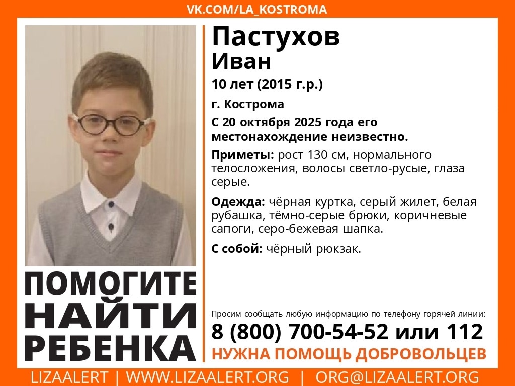 В Костроме ищут 10-летнего Ваню Пастухова. 20 октября школьник ушел из дома и не вернулся, сообщает добровольцы поисково-спасательного отряда «ЛизаАлерт» в официальной группе ВКонтакте.