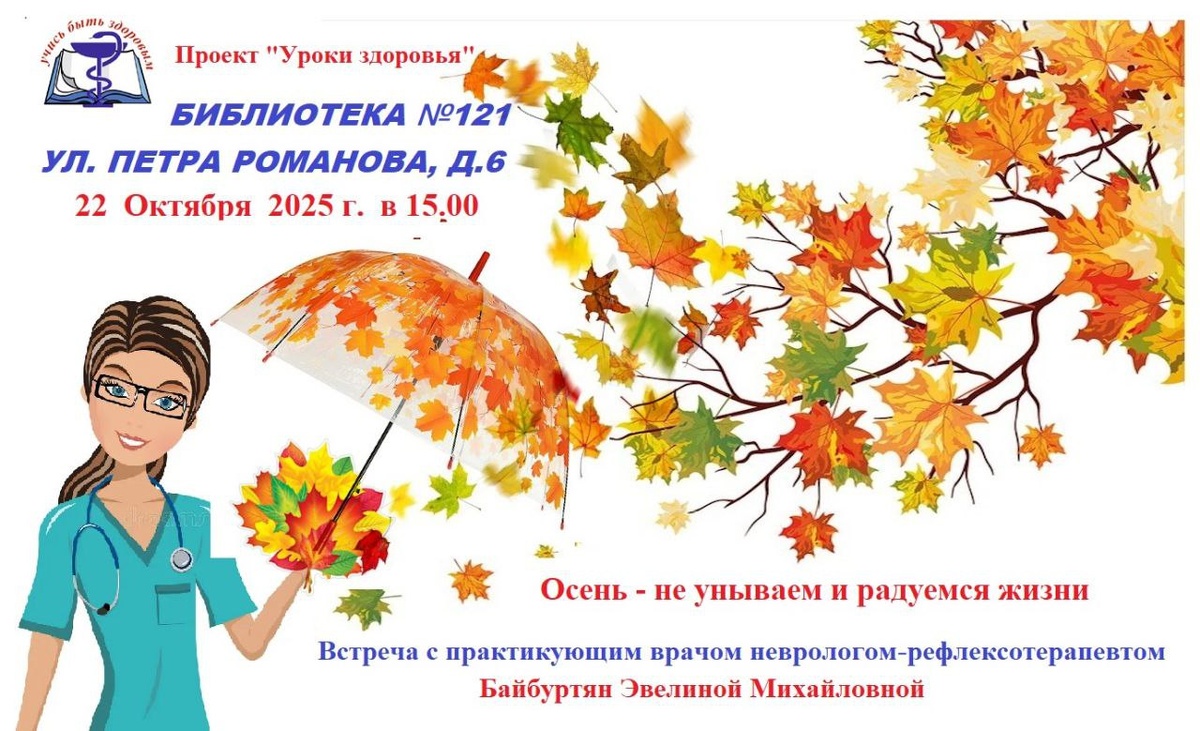 Приглашаю 22 октября на встречу с практикующим врачом неврологом-рефлексотерапевтом. Время: 15:00 Место: Библиотека №121 по адресу ул. Петра Романова дом 6.