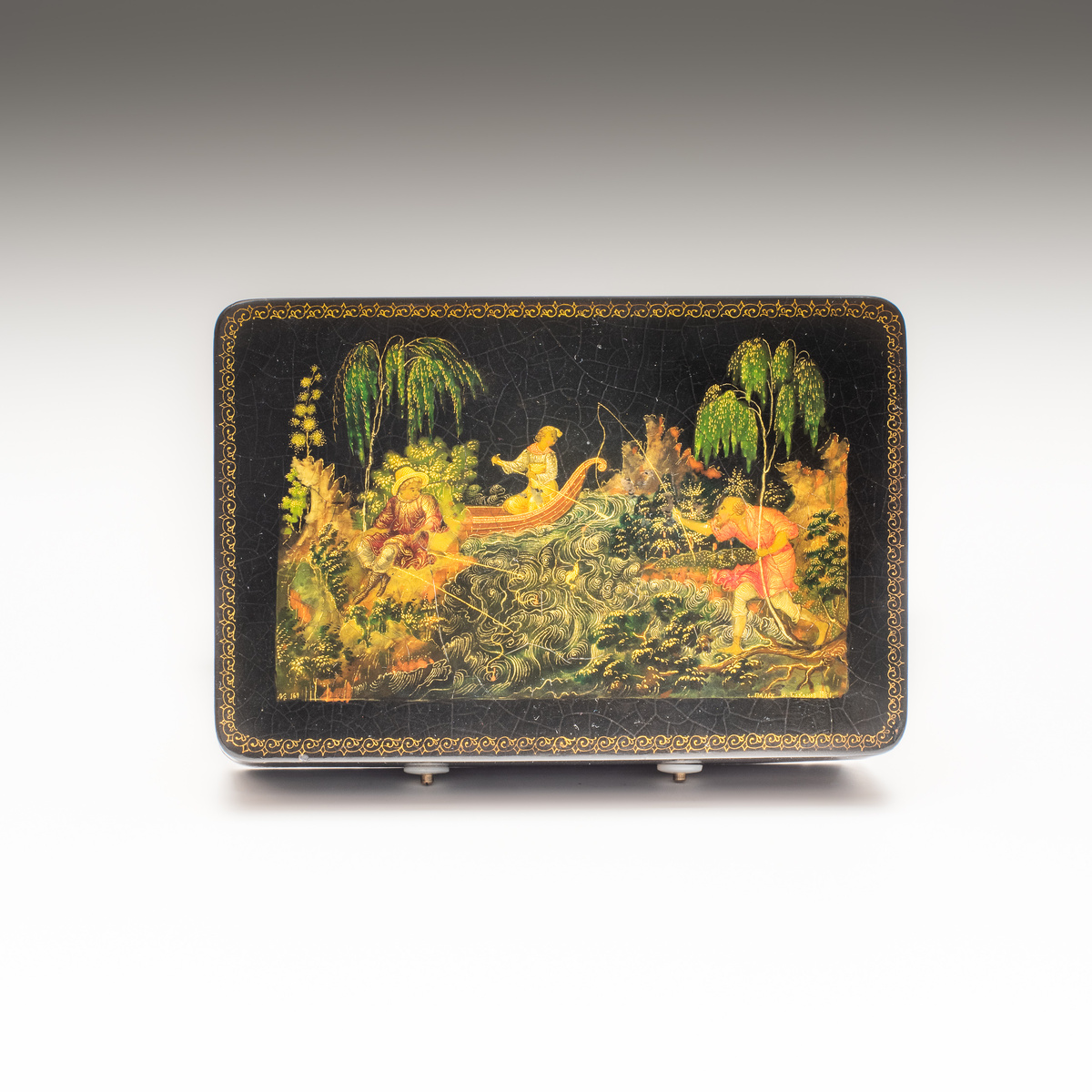 Каждый слой лака требует не просто мастерства, а выдержки: нанесение, сушка, полировка — и снова по кругу, десятки раз. Лак не терпит спешки, ошибок и компромиссов. Именно в этом — его философия: красота рождается из медленного труда, из умения ждать. История русского лака начинается в XVIII веке — в подмосковных селах Федоскино, Мстёра, Холуй, Палех. Там мастера создавали миниатюры на папье-маше, вдохновленные иконописной традицией. Когда религиозная живопись ушла с переднего плана, лаковые мастера стали хранителями утраченного света — переводя духовное в светское, но сохраняя ту же глубину. Каждая миниатюра — это не просто изображение, а собеседник времени. Сюжеты из сказок, былин, народных праздников, охоты, крестьянского быта — всё это собрано в тончайшей росписи, покрытой прозрачным блеском, словно застывшим светом. Русский лак — это искусство равновесия. Между тьмой и сиянием, между плотностью красок и лег