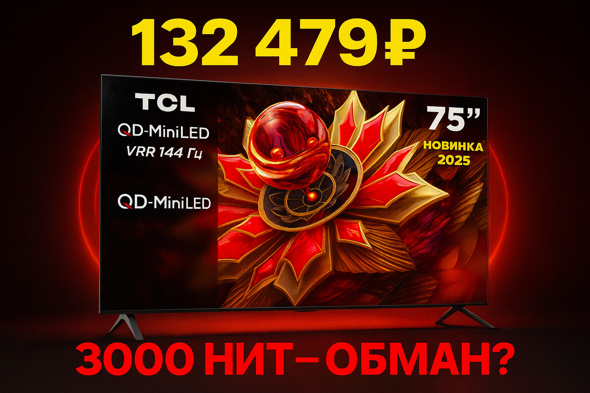 И тут попался TCL 75Q7C. 132 тысячи со скидкой вместо 164. Технология QD-Mini LED (типа как у топовых моделей), 3000 нит яркости HDR, 144 Гц, звук Bang & Olufsen, Google TV. На бумаге выглядит как флагман за цену среднячка. Думаю — а чё, рискну. TCL же в последние годы прорвались, делают годные телеки.