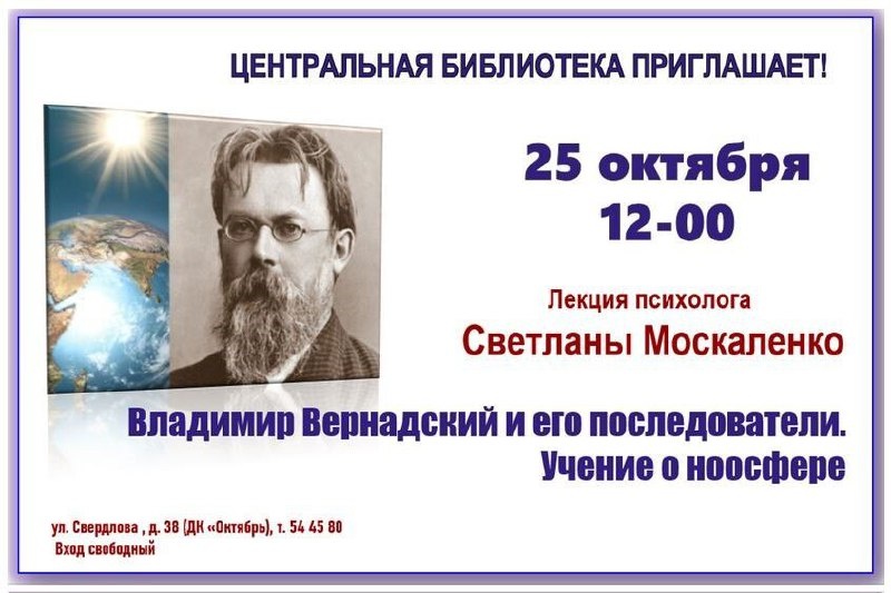 ✨ Лекция психолога Светланы Москаленко 👉Психолог Светлана Москаленко проведет лекцию, посвященную выдающемуся ученому Владимиру Вернадскому и его концепции «ноосферы». 💫В лекции будет рассмотрено влияние идей Вернадского на развитие психологии и философских взглядов современности. 🚫 Возраст: 14+ 📆 25.10.2025 🕒 12:00 🏢 Центральная библиотека 📍 г. Подольск, ул. Свердлова, д. 38 💰 Вход свободный❗️ ⭐Поддержать канал голосом 💰 Вакансия - курьер в Подольске ✅ Мероприятия Подольск https://dzen.ru/id/66ed500f7b5671493eca3fd6 http://vk.com/podolsk_events http://dzen.ru/podolsk_events