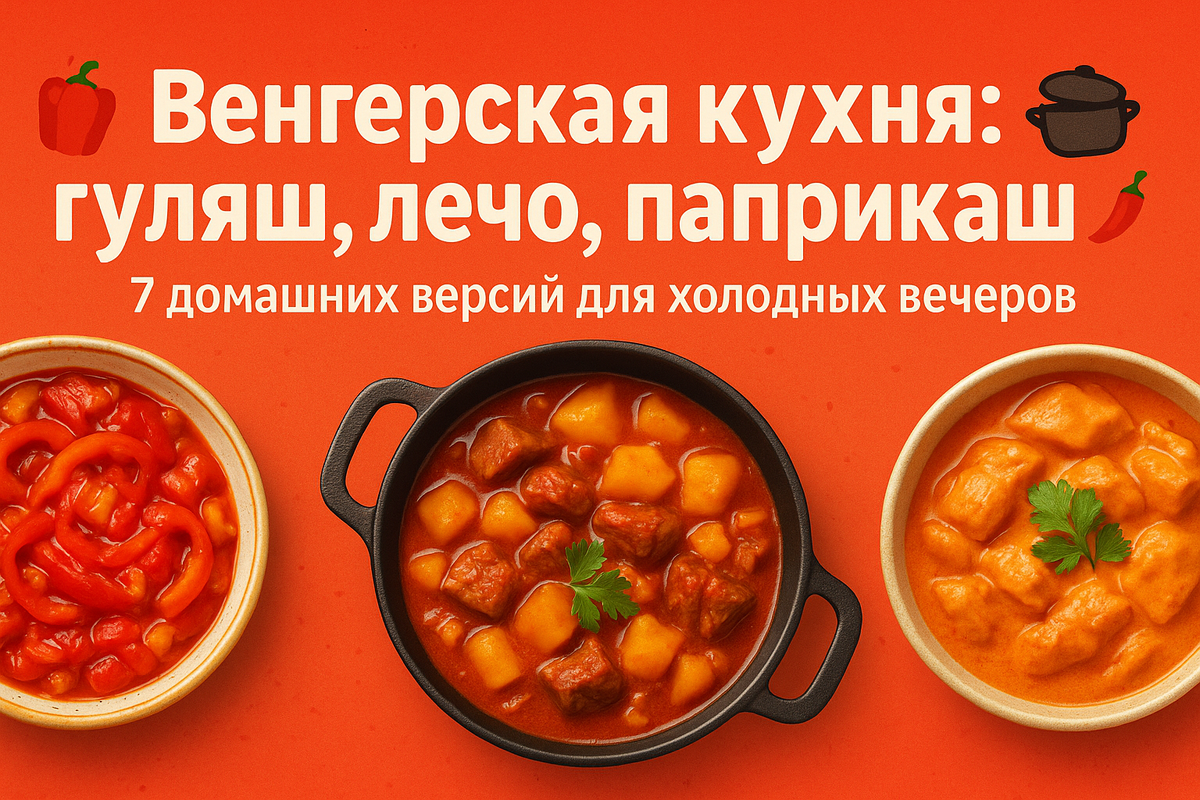 Я подобрала 7 рецептов Венгерской кухни. Всё — проверено временем и людьми; продукты — из наших магазинов и рынков; на зиму — честные замены: томаты в с/соку, замороженный перец, лук и сметана всегда под рукой. Пишу от первого лица, как у плиты перед вами: расскажу нюансы, дам ориентиры по огню и времени, подскажу, как хранить и что подать рядом, чтобы вечер был тёплым до конца. Поехали!