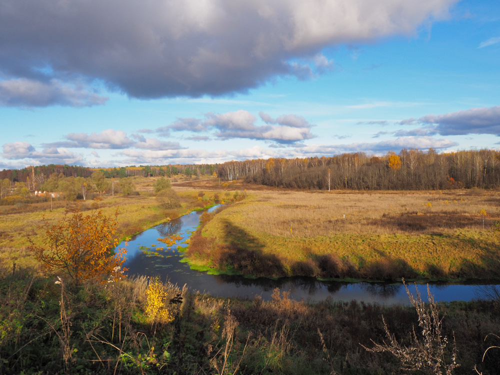 Поездку в Кощеево обычно делю на две части. Вначале заезжаю в деревню Киньдяково, откуда с высокой точки открывается панорама села. Когда съехал с трассы на грунтовку, убедился, что еще не все так безнадежно в плане осенних красок. Кое-что из красочной палитры сохранилось.