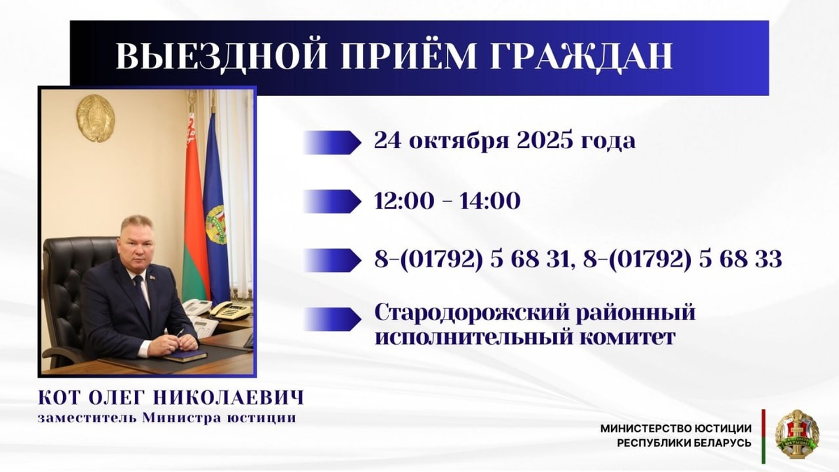☎️☎️☎️☎️☎️☎️☎️☎️ 🗓24 октября 2025 года с 12:00 до 14:00 часов заместитель Министра юстиции Республики Беларусь Кот Олег Николаевич проведет выездной прием граждан в Стародорожском районном исполнительном комитете (г. Старые Дороги, ул. Пролетарская, 38, каб. 88) по вопросам, относящимся к компетенции Министерства юстиции. 📞Предварительная запись на прием будет осуществляться через Стародорожский райисполком по телефонам: 8-(01792) 5 68 31, 8-(01792) 5 68 33. 💪💪💪💪| Сайт | Telegram | Instagram | Fb | X | Ok | VK | YouTubе
